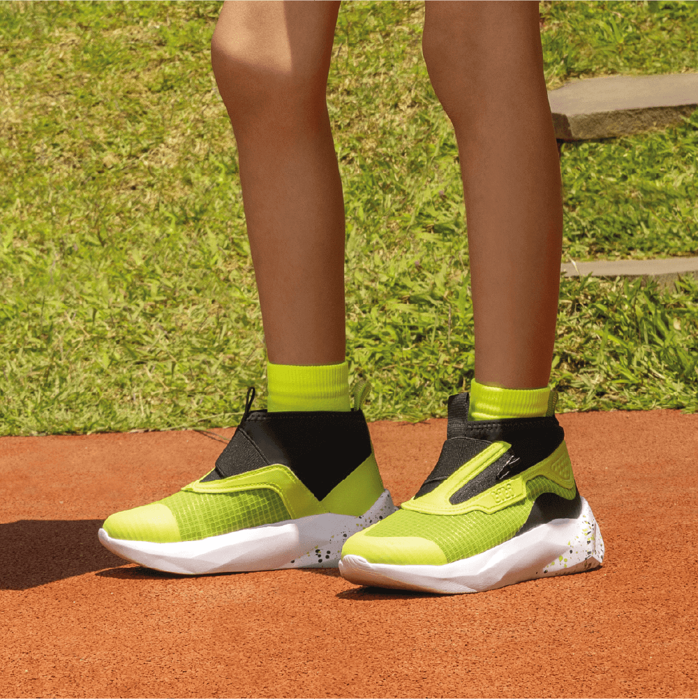 Calçados livres de cadarços e amarrações, confeccionados com materiais que se ajustam no pezinho e facilitam o calce.