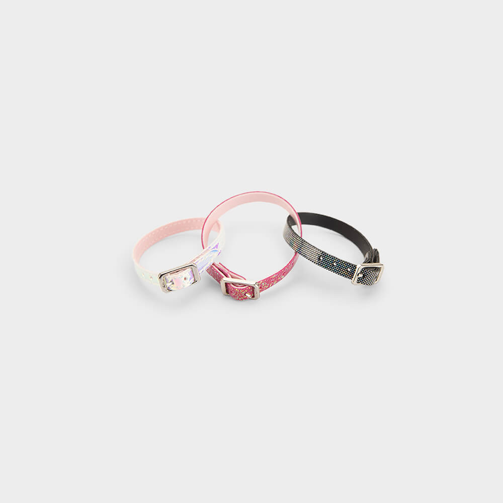 O kit contém três pulseiras em cores diferentes.